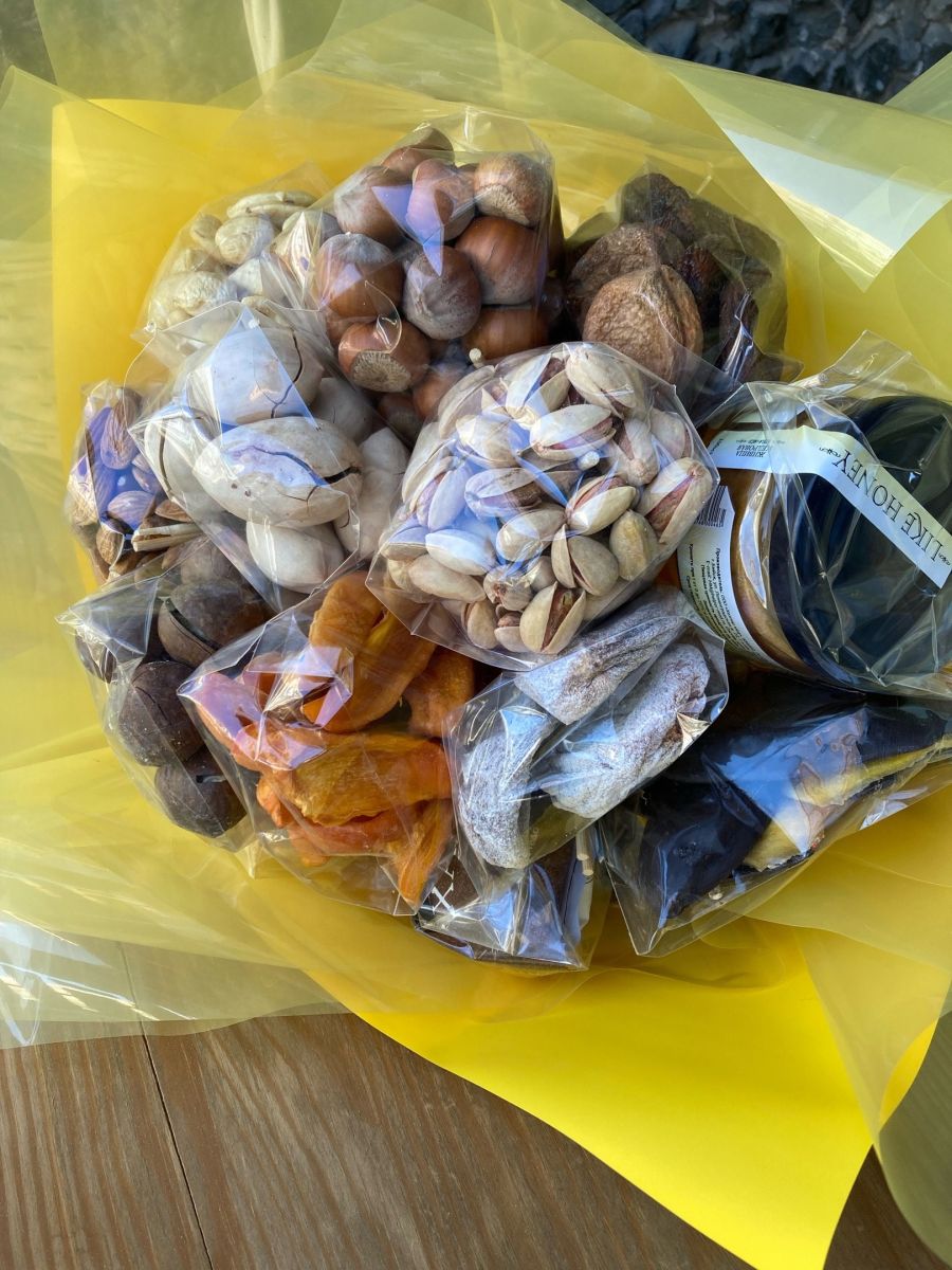 отличные, оригинальные подарки учителям, педагогам и воспитателям на выпускные! ВКУСНЫЙ БУКЕТ Вес 1.975 кг Натуральная курага, манго в шоколаде хурма слайсы, груши вяленая из Армении фисташка из Ирана фундук Абхазия скорлупке Миндаль из Чили очищенный пекан в скорлупке макадамия в скорлупке финик королевский халва порционная: арахисовая подсолнечник, кунжутная кешью очищенный крем мёд изюм сочный гибрид