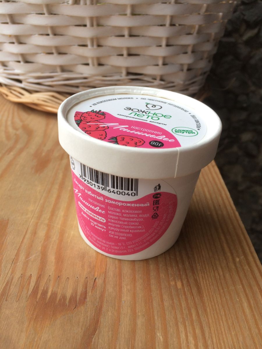 окосовое молоко, малина, вода, сироп топинамбура, кокосовый сахар, инулин (пребиотик), вафельный рожок (мука пшеничная, сахар, масло кокосовое, клетчатка пшеничная (волокна), эмульгатор лицетины (соевый), вода, ароматизатор пищевой «Ванилин»)