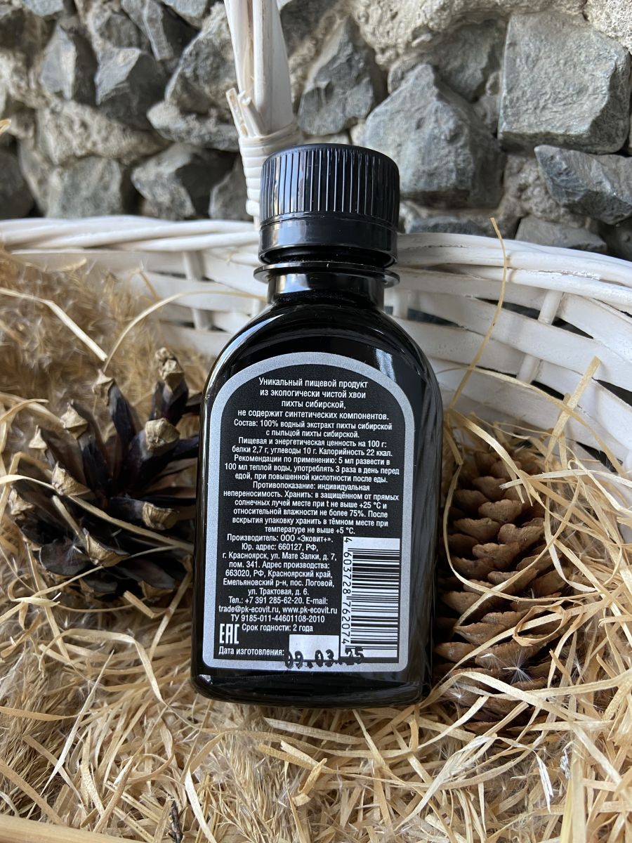 ЭКСТРАКТ ХВОЙНЫЙ НАТУРАЛЬНЫЙ ПИХТОВЫЙ - концентрированный напиток на каждый день, с насыщенным хвойным вкусом и приятной пихтовой кислинкой. Экстракт натуральный пихтовый - 100% натуральное водорастворимое вещество, которое производится из хвои пихты сибирской, растущей в экологически чистых районах Сибири, путем паровой дистилляции. Вещество не содержит тяжелых смол и эфиров, консервантов. Изучен при поддержке Института Химии г.Сыктывкар; ФГБУ «Пятигорский Государственный Научно-Исследовательский Институт Курортологии Федерального Медико-Биологического Агентства»; Омского Туберкулезного диспансера, Института питания г. Красноярск. Чем полезна хвоя Пихта с древних времен используется в народной медицине, ее лечебные свойства бесценны. Хвоя и молодые ветки пихты содержат от 3 до 3,5% эфирного масла, которое состоит из 30 – 60 % борнилацетата, от 10 до 20 % камфена, от 8 до 12% α- пинена,а также α-фелландрена, бисаболена. Хвоя пихты содержит витамин С в количестве 0,3%, а в коре растения содержится 13% дубильных веществ и 15% пихтового бальзама (экстракта). В семенах растения присутствует витамин Е и более 30% жирных масел. Сбалансированный самой природой комплекс активных веществ, способствует защите, обогащению и питанию организма на клеточном уровне. - оказывает успокаивающее, регенерирующее, антимикробное, общеукрепляющее действие на организм. - восстанавливает работу желудочно-кишечного тракта. Не влияет на полезную микрофлору и поддерживает баланс минеральных веществ в организме. - нормализует обмен веществ (функциональные и органические нарушения функции желудка, желудочно-кишечного тракта) - подавляет воспаление, снимает симптомы интоксикации и диспепсии, эффективен при синдроме алкогольного опьянения. - связывает и выводит аллергены, токсины, свободные радикалы (пищевые отравления, в том числе алкогольная интоксикация)• - является гепатопротектором, усиливает моторную функцию кишечника, может оказывать послабляющее действие (нарушения функции печени). - способствуют обогащению и питанию клетки, сокращая витаминное голодание организма - эффективно как косметическое средство при себорее, для регенерации и очищения кожи. Пихта помимо полезных свойств, имеет ряд противопоказаний в применении: детский возраст до 1 года, беременность, индивидуальная непереносимость. Так как пихта способна повышать кислотность применять вещества из хвои желательно после еды