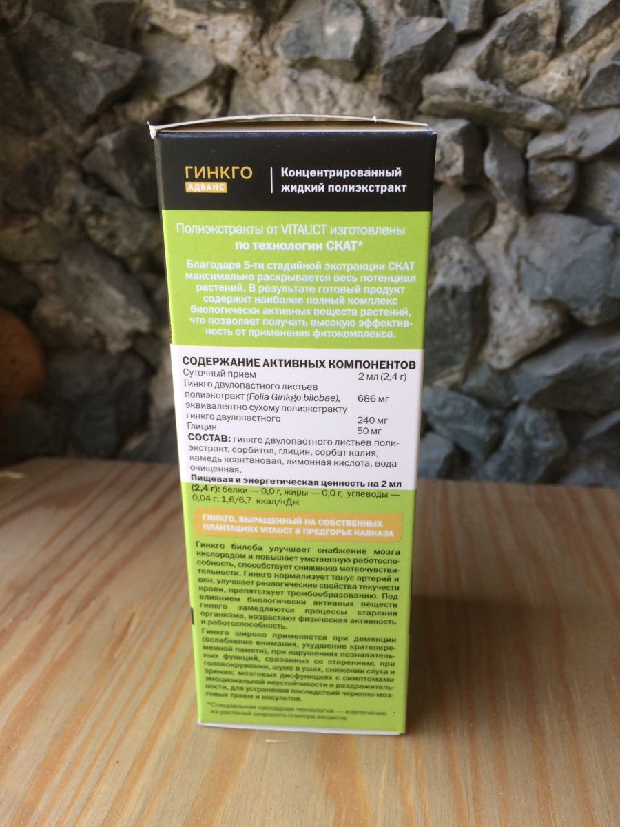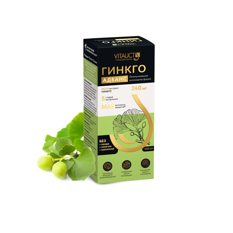 Гинкго Адванс Для мозга, памяти и внимания Компоненты способствуют: Улучшению мозгового кровообращения, памяти и внимания Устранению головной боли, головокружения и шума в ушах Снабжению клеток кислородом Уменьшению риска инфарктов и инсультов Укреплению сосудов и капилляров Снижению метеочувствительности