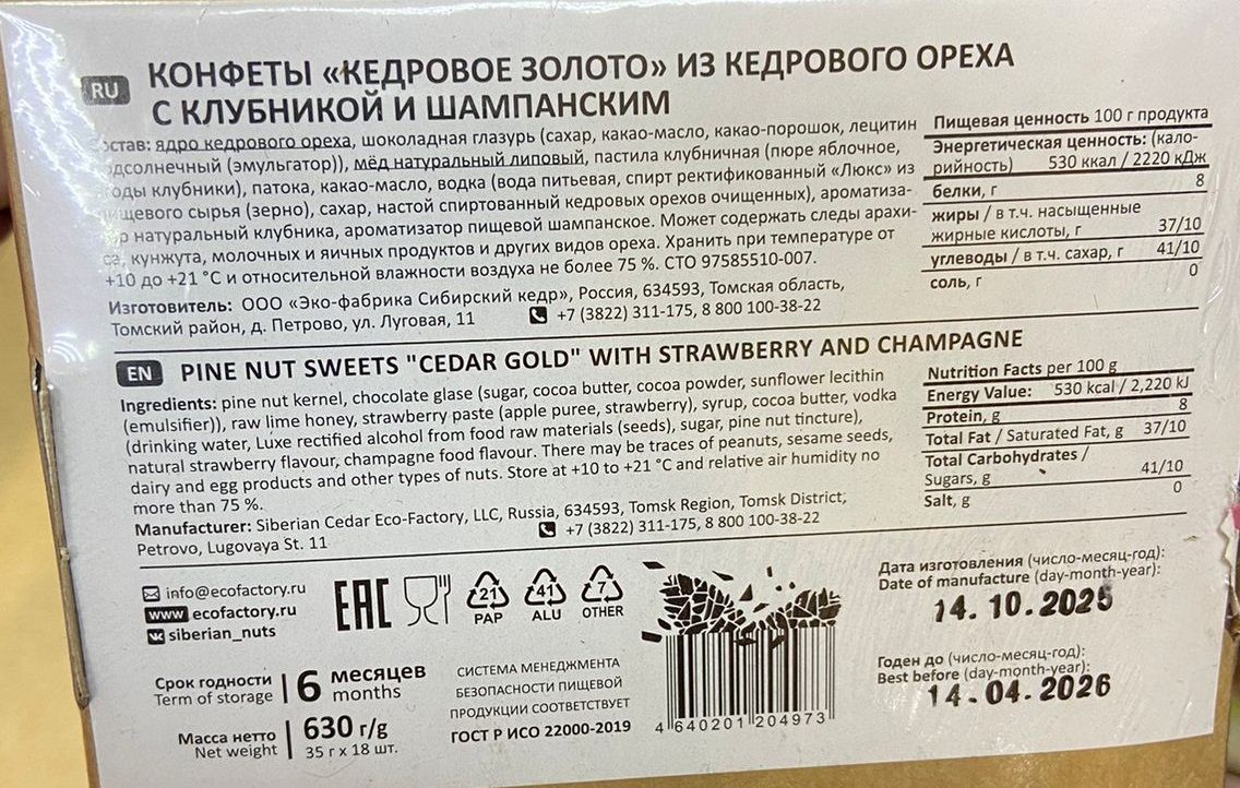 Читать все статьиКедровое золото, с клубникой и шампанским, 1 уп (18шт)