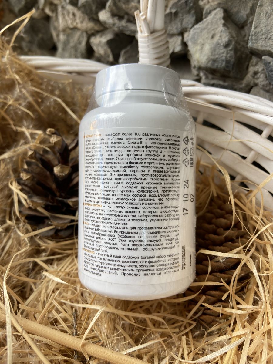 ЧЕРНЫЙ ТМИН - содержит в своем составе более 100 различных компонентов, лидирующую позицию занимает линолевая полиненасыщенная кислота Омега-6, мононенасыщенная кислота Омега-9, фолфолипиды, фитостерины и витамины группы В, которые являются отличными помощниками для решения проблем женской и мужской репродуктивных систем, способствуют повышению либидо и восстановлению гормонального баланса в организме, укрепляют иммунитет, нормализуют выработку тестостерона, улучшают работу сердечно-сосудистой, нервной и пищеварительной систем, обладают бактерицидным, противовоспалительным, противопаразитарным, противогрибковым свойствами. Кроме того, масло черного тмина содержит огромное количество фитостерина, который выводит вредные токсические соединения, нормализует уровень холестерина, препятствует образованию бляшек на стенках сосудов, нормализует работу кишечника, оказывает мочегонное действие, что позволяет вывести из организма лишнюю жидкость и снизить вес. КОРЕНЬ ЛОПУХА - хотя лопух считают сорняком, в нем находится множество полезных веществ, которые способствуют угнетению роста чужеродных клеток, нейтрализации свободных радикалов, выведению шлаков и токсинов, улучшению состава крови и укреплению иммунитета. ЧАГА – издавна использовалась для профилактики желудочно-кишечных заболеваний. Ее применяли для замедления скорости роста новообразований (особенно на ранней стадии), для улучшения работы ЖКТ (при опухолях желудка, пищевода, поджелудочной железы). Чага отлично себя зарекомендовала как противовоспалительный, общеукрепляющий и бактерицидный гриб. ПРОПОЛИС – пчелиный клей содержит богатый набор микро- и макроэлементов, витаминов, аминокислот и ферментов, которые способствуют укреплению иммунитета, обладают бактерицидным эффектом, повышают защитные силы организма, предупреждают рост новообразований. Прополис является отличным антиоксидантом.