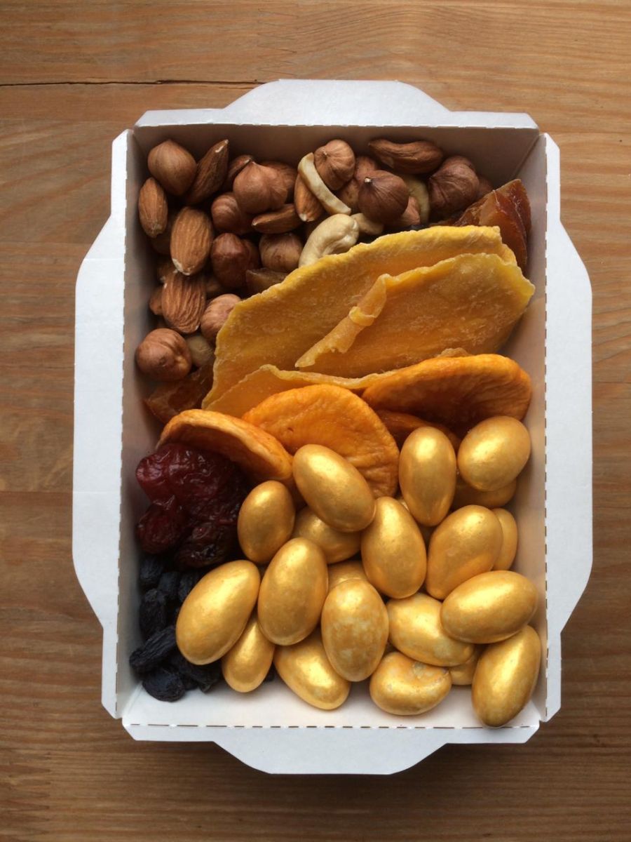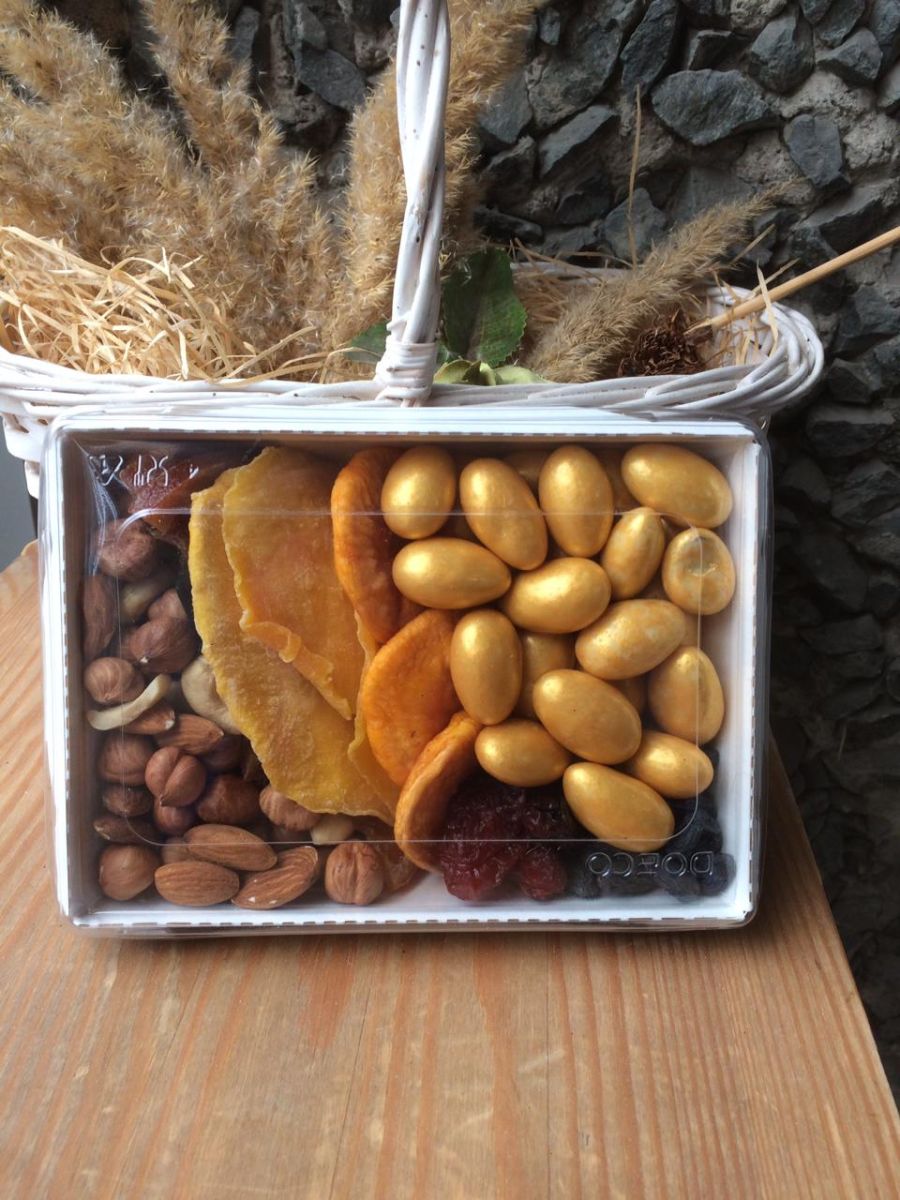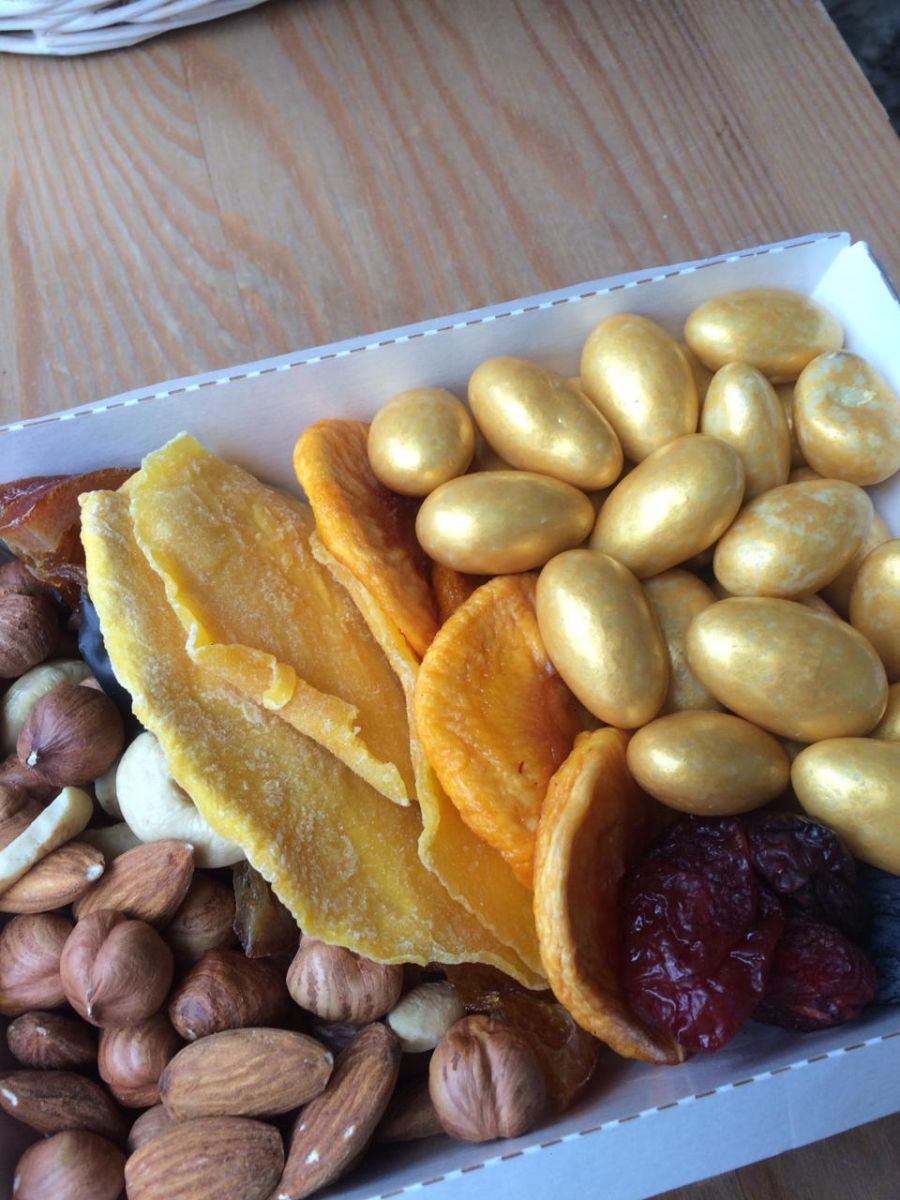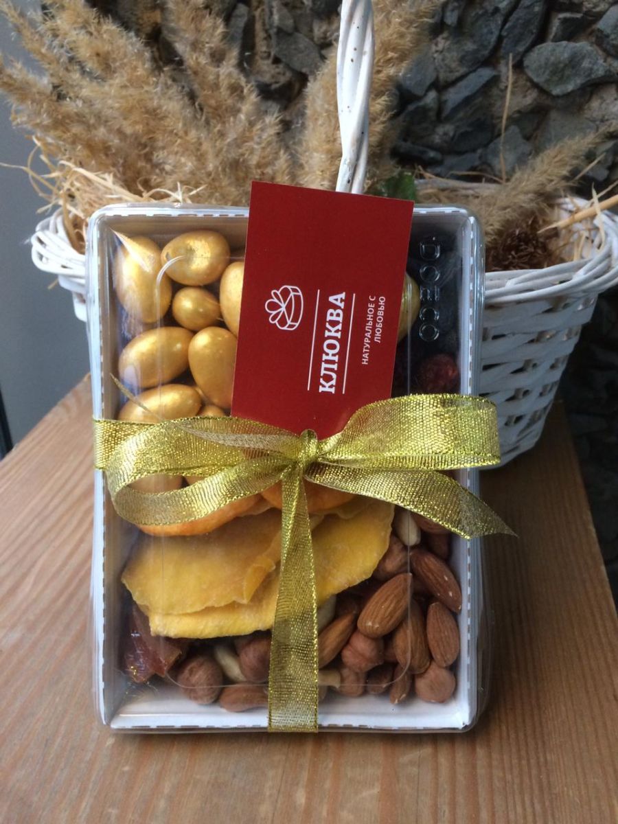 ВКУСНЫЕ, СВЕЖИЕ ЦУКАТЫ В ассортименте (из наличия в момент сборки подарка): вишенка, клубничка, киви, дыня канталупа, апельсин в шоколаде, манго в шоколаде, помело светлый и зеленый), орех миндаль или фундук в шоколаде и глазури + БАНТ