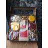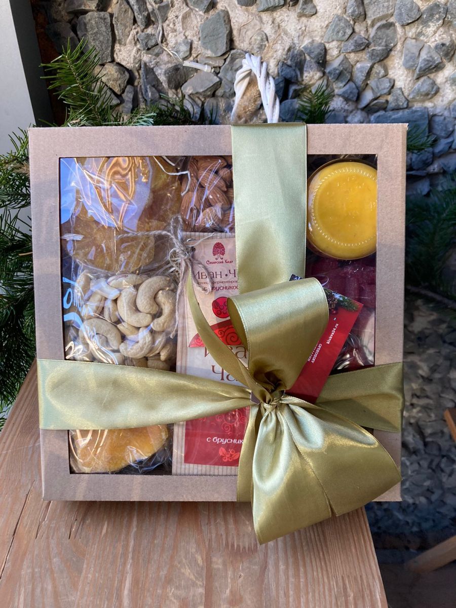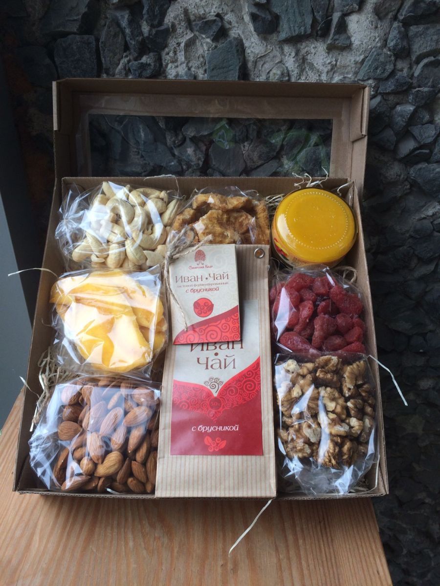 из наличия в момент сборки подарка цукаты: вишенка, клубничка, апельсин/манго или грецкий орех в шоколаде, орех миндаль из Чили, миндаль или фундук в шоколаде и глазури, макадамия, груша или персик из Армении, клюква цукат, конфеты кедровые в ассортименте из наличия + БАНТ