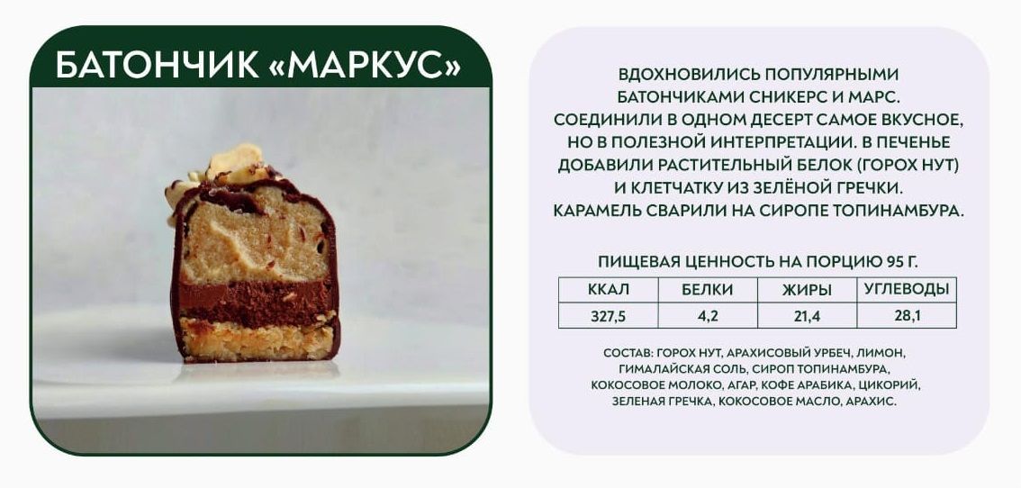 нут, арахисовый урбеч, лимон, гималайская соль, сироп топинамбура, кокосовое молоко, агар, кофе арабика, цикорий, зелёная гречка, какао, кокосовое масло, бельгийский тёмный шоколад в корпусе с тростниковым сахаром