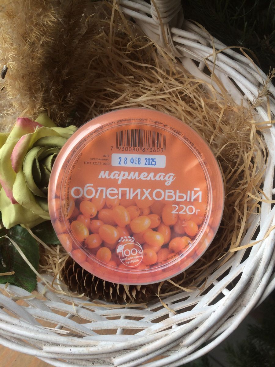 Сахар, облепиха, вода, пектин, регулятор кислотности: лимонная кислота, сорбиновая кислота. Пищевая ценность в 100 г продукта: Углеводы –40 г. Энергетическая ценность в 100 г продукта: 160 Ккал/ 680 Кдж