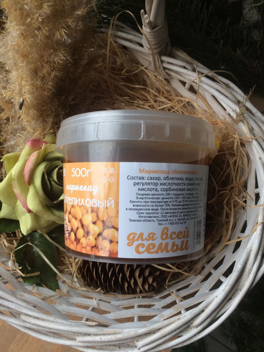 Сахар, облепиха, вода, пектин, регулятор кислотности: лимонная кислота, сорбиновая кислота. Пищевая ценность в 100 г продукта: Углеводы –40 г. Энергетическая ценность в 100 г продукта: 160 Ккал/ 680 Кдж