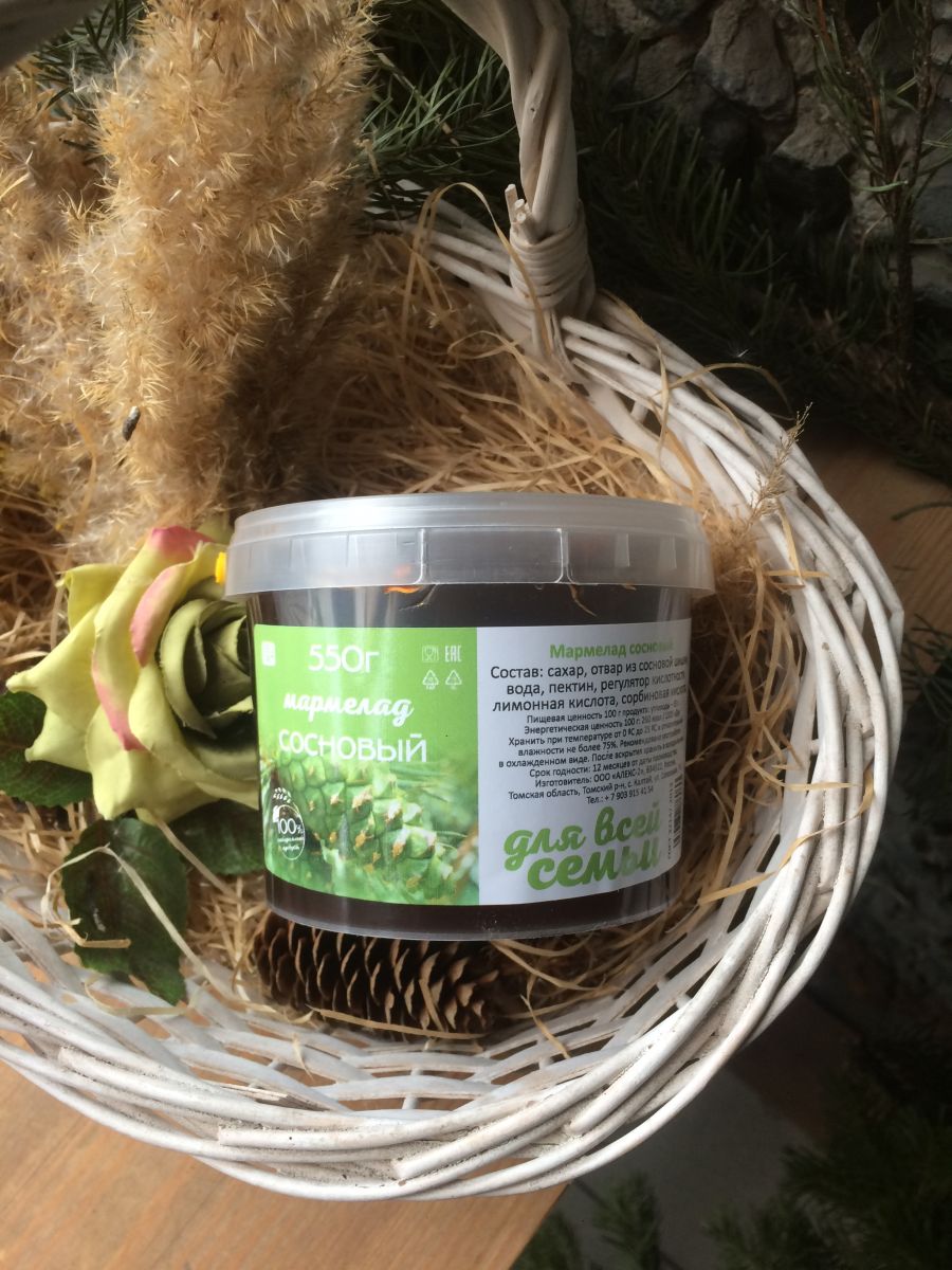 Сахар, сосновая шишка, вода, пектин, регулятор кислотности: лимонная кислота, сорбиновая кислота. Пищевая ценность в 100 г продукта: Углеводы –65 г. Энергетическая ценность в 100 г продукта: 260 Ккал/ 1105Кдж