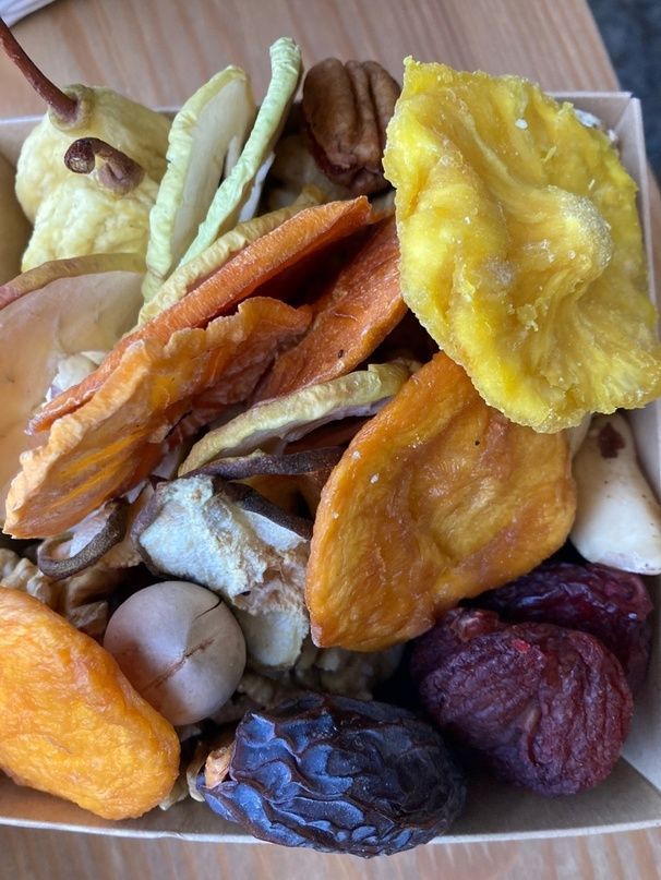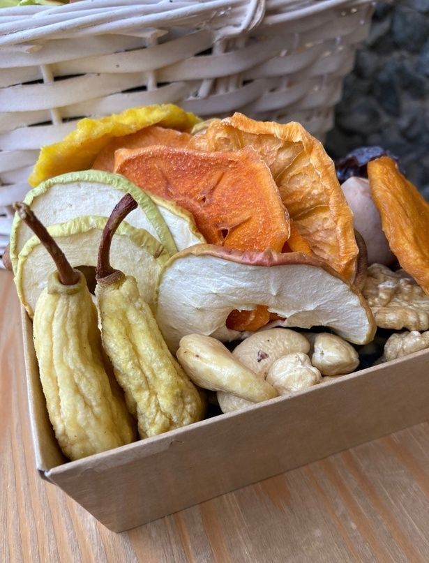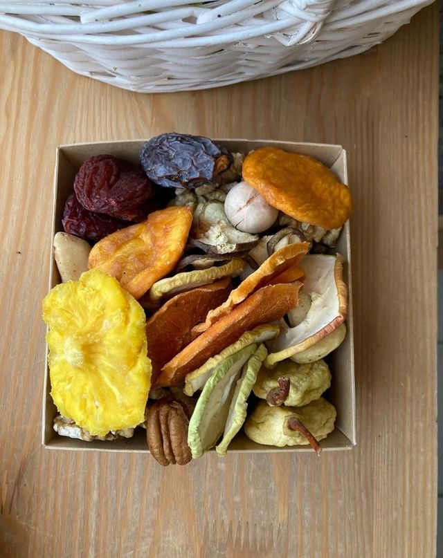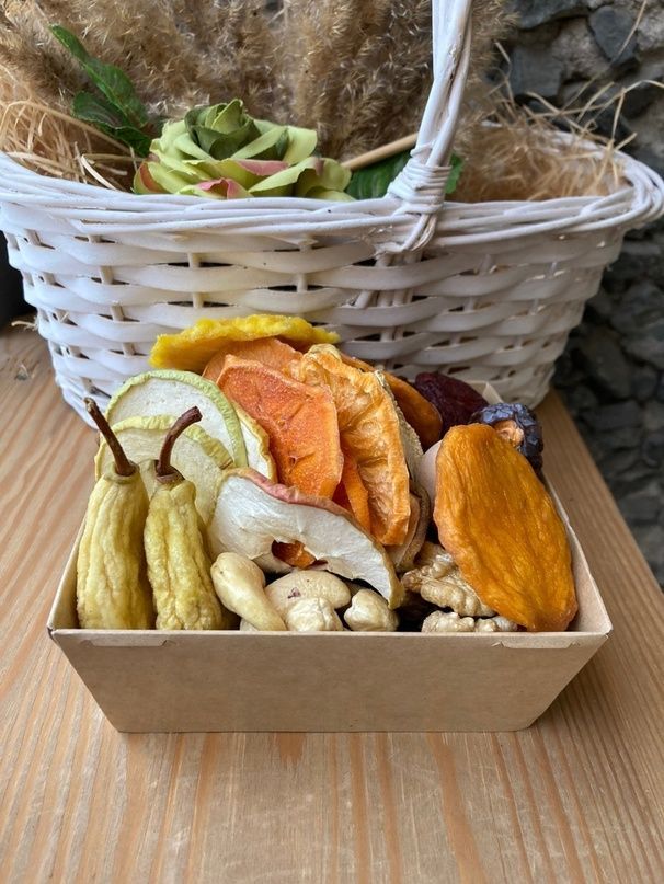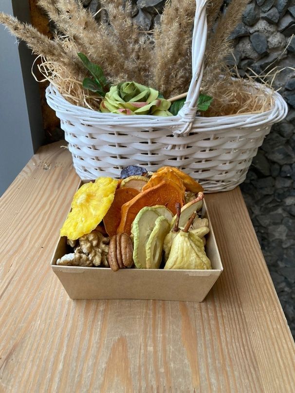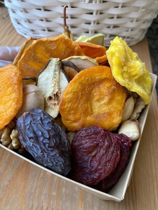 Состав: Грецкий орех очищенный Орех пекан скорлупки Орех пекан очищенный Персик, груша и слива Армения Слайсы: хурма, яблоко и груша Финик королевский Кешью отборный Изюм соком виноградом внутри кишмиш