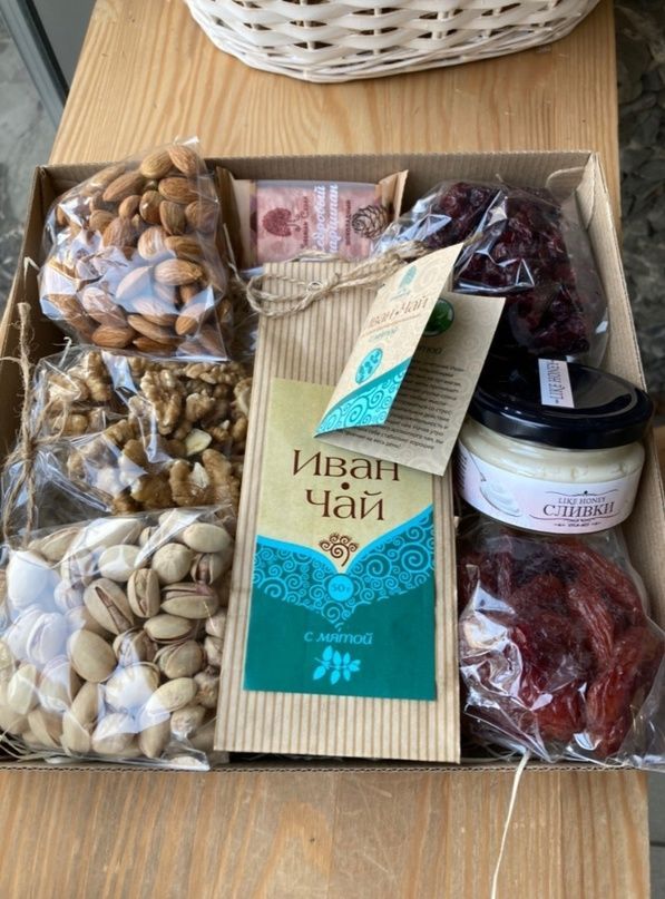 Состав: Грецкий орех Крупный, сладкий миндаль из Чили Фисташка вкусная натуральная Иран Слива красная Армения Клюква вяленая натуральная Крем-мёд в ассортименте к ароматному ферментированному иван чаю насыщенного цвета и вкуса с мятой