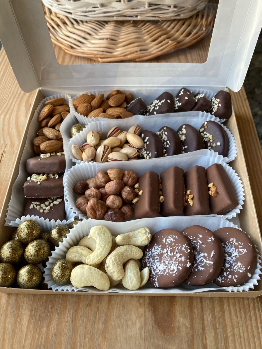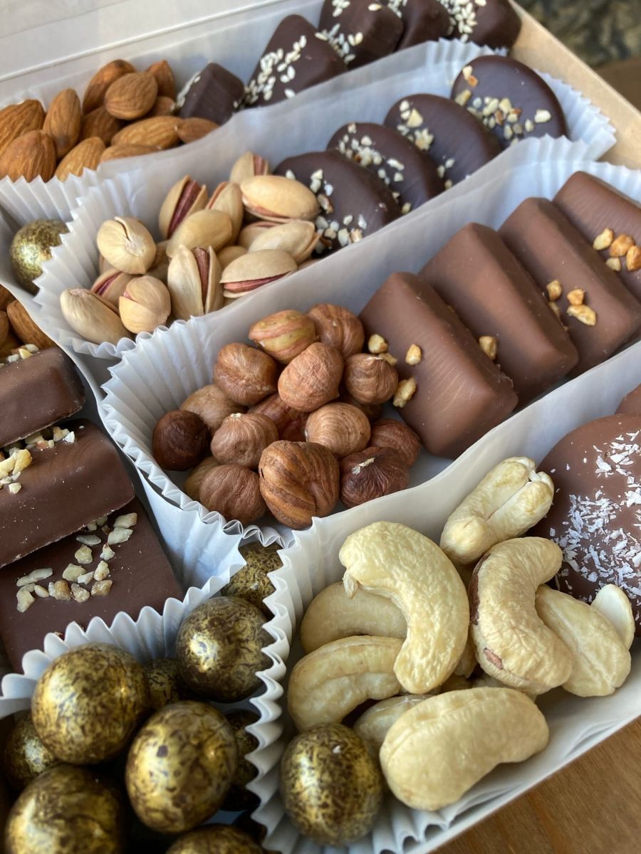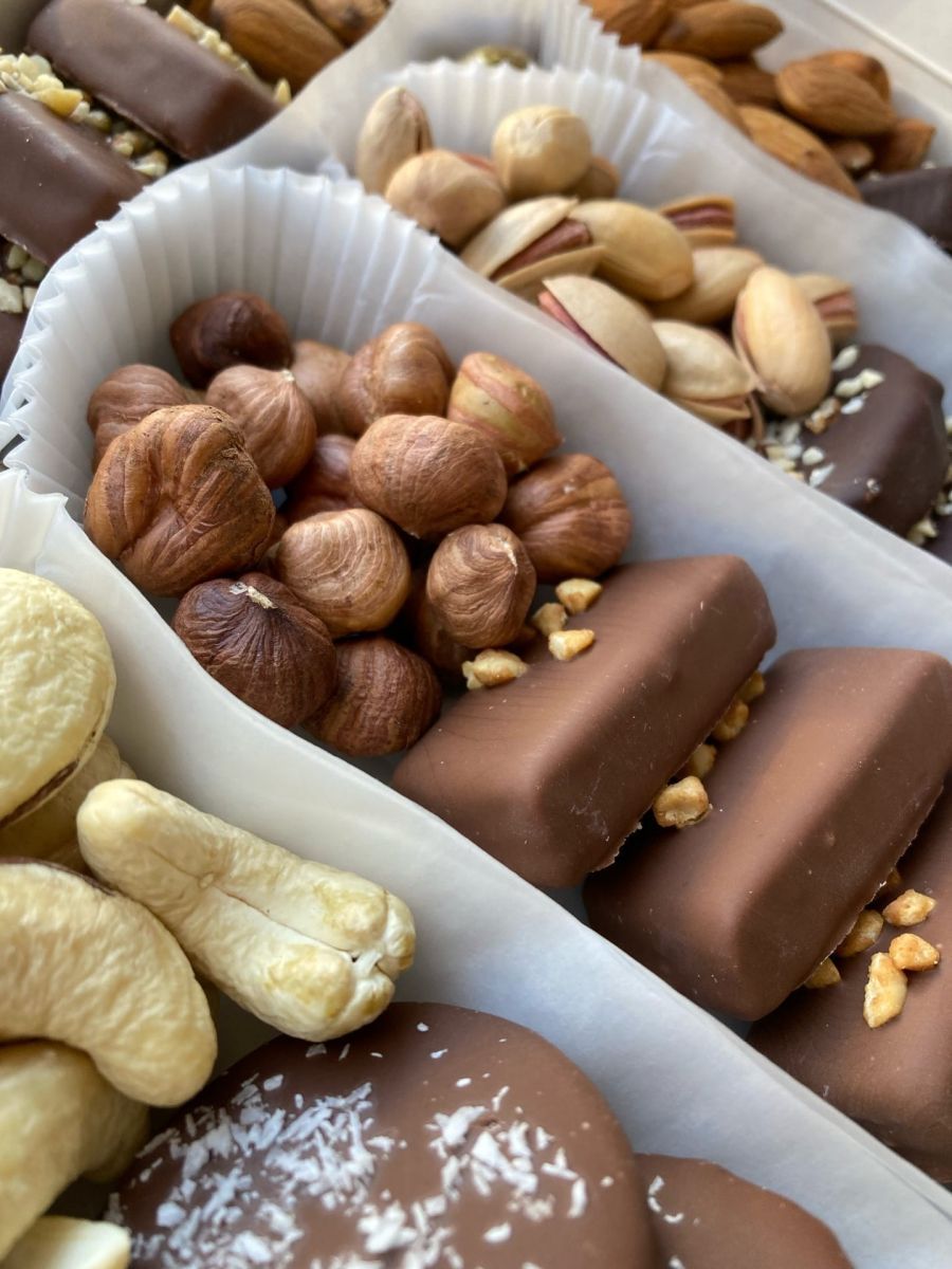 конфеты из бельгийского шоколада, кешью, фисташка, фундук, миндаль, фундук/минадаль в шоколаде и цветной глазури