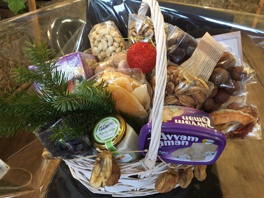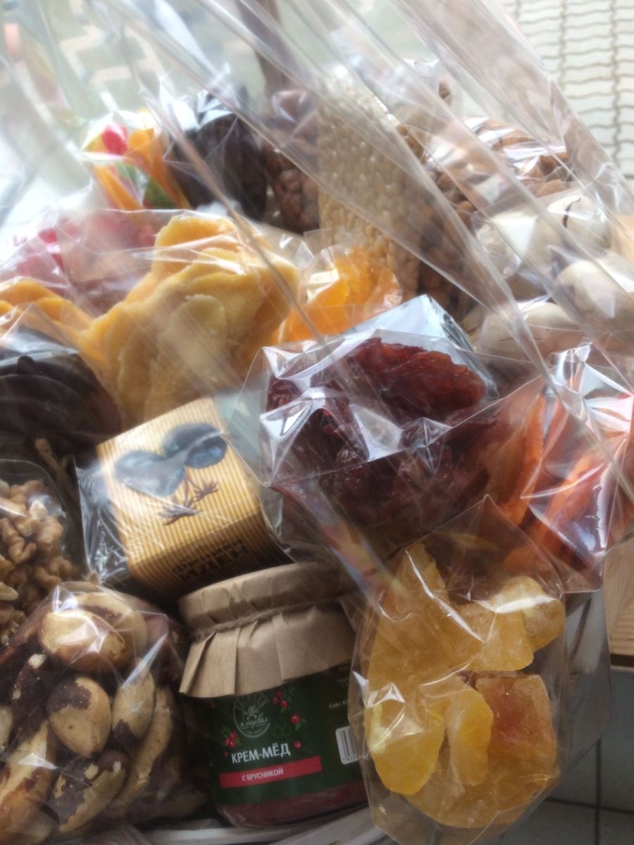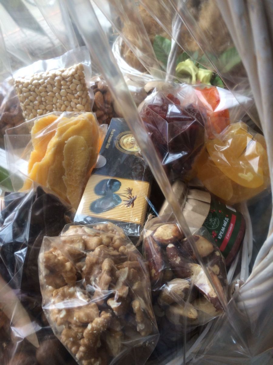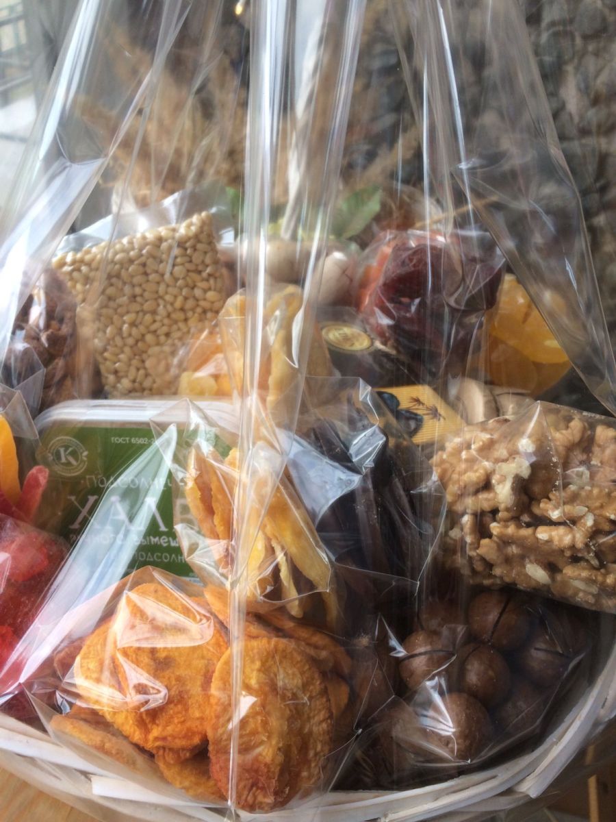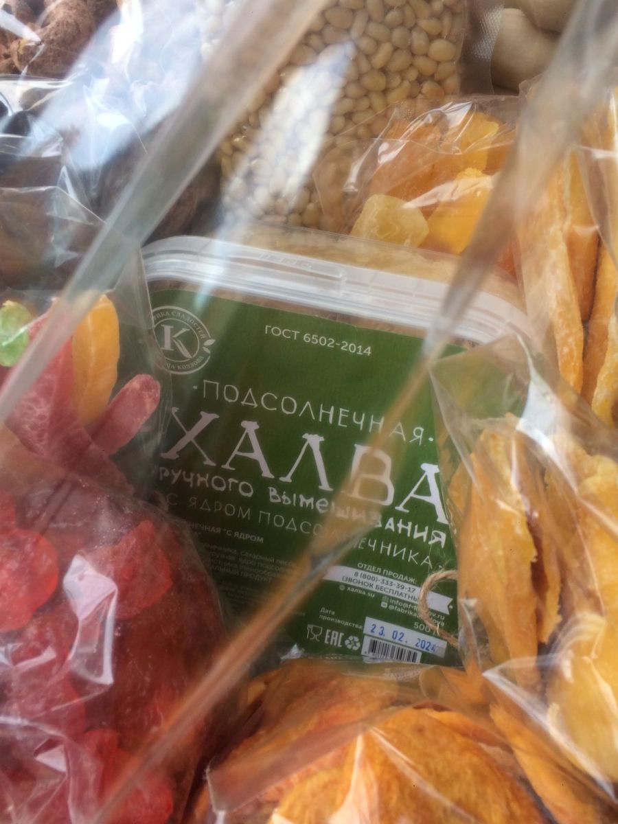 Халва натуральная, ручного вымешивания из подсолнечника с ядром подсолнечника, макадамия в скорлупке, финики из Ирана сорта Мазафатти, кешью в скорлупке из Индии, миндаль очищенный сладкий, персик, груша и слива вяленая из Армении, манго вяленое 5% сахара, цукаты апельсиновые дольки в шоколаде, вишня или клубничка цукат, крем мёд с брусникой, бразильский орех очищенный, хурма слайс натуральная, пекан в скорлупке, ядро кедрового ореха, грецкий орех в скорлупке из чили