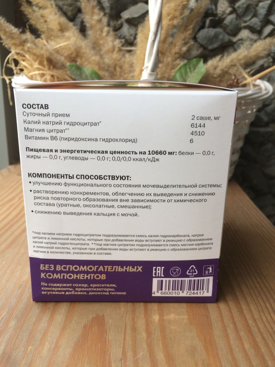 Цитратная смесь для растворения камней Компоненты способствуют: Повышению растворимости солей и предотвращению образования мочевых камней Выведению солей мочевой кислоты и предотвращению их отложения в суставах Улучшению функционального состояния мочевыделительной системы Растворению конкрементов, облегчению их выведения и снижению риска повторного образования вне зависимости от химического состава (уратные, оксалатные, смешанные) Снижению выведения кальция с мочой Нормализации кислотно-щелочного баланса Профилактике камнеобразования при подагре Повышению эффективности литотрипсии