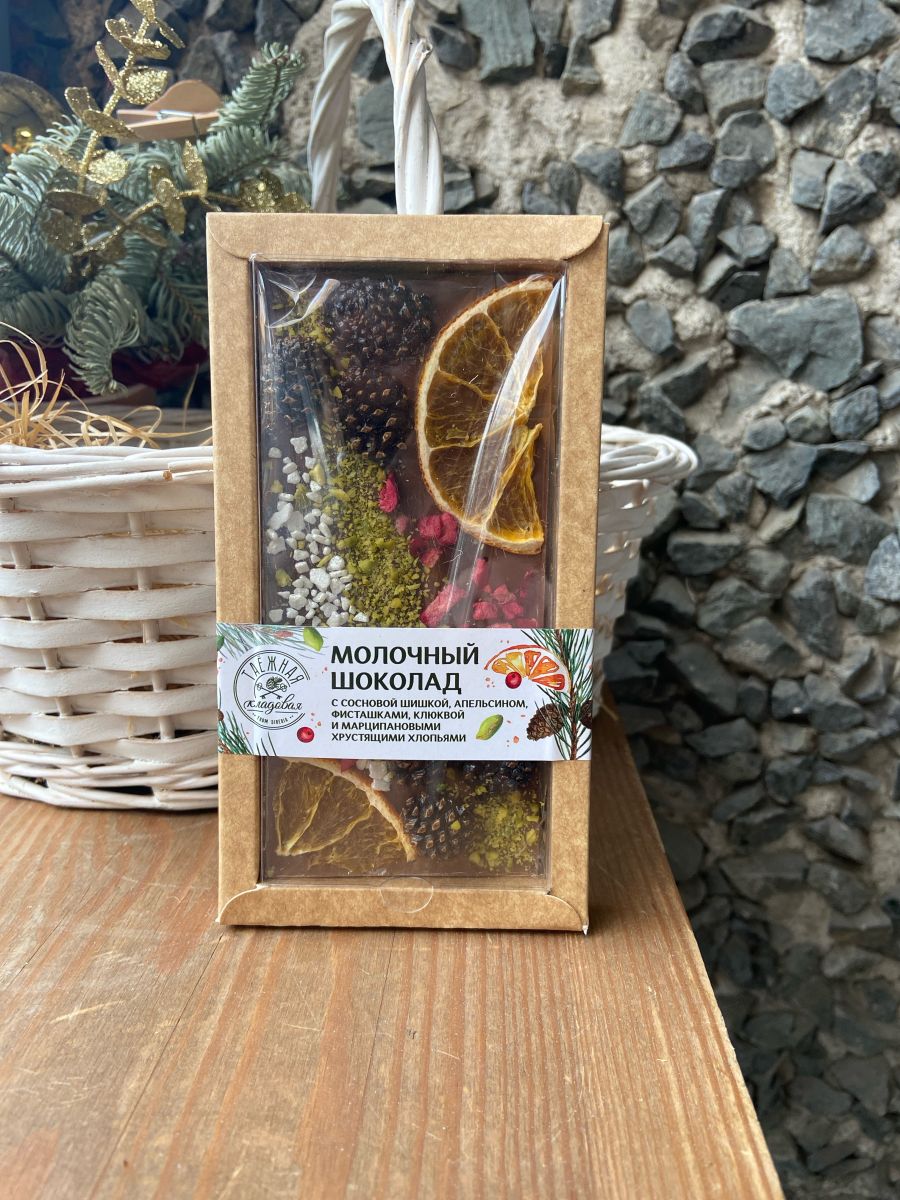 Молочный шоколад с сосновой шишкой/апельсином/фисташками/клюквой/марципановыми хрустящими хлопьями